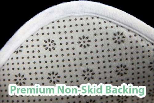 It has a unique non-skid backing made of hundreds of tiny pellets that gently grip the floor without abrasion, making it work on floors of all types from hardwood to tiles of all kinds.
